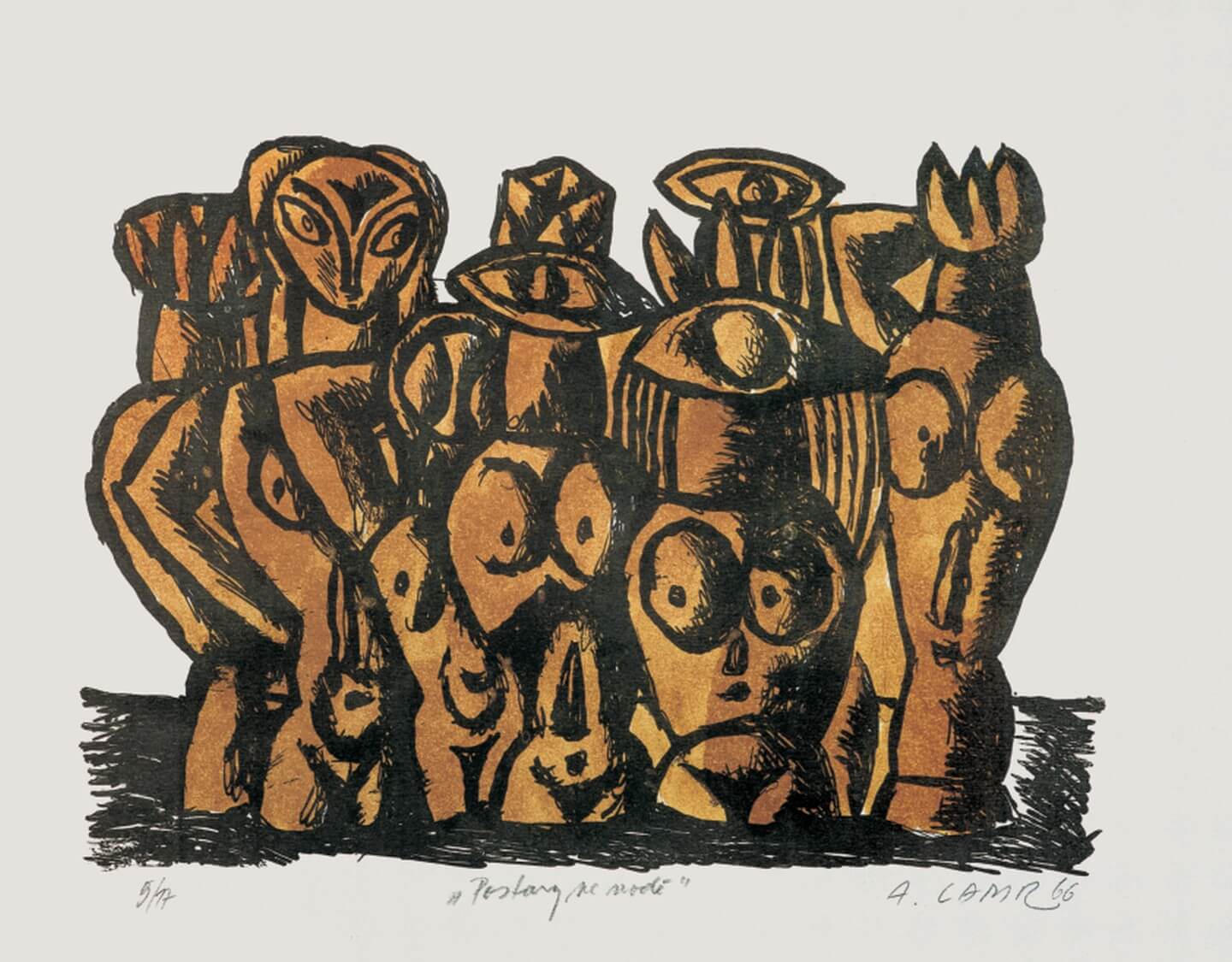 Lamrova groteska ale byla již od počátku veselá, ovládal ji plývajícími ze rmutných existenciálních úvah. osvobozující anarchismus výtvarného gagu. Vyjadřovala nekomplikovanou radost z pestré proměnlivosti světa. Důležitou roli zde hrála volná organizace zobrazivých, polozobrazivých i abstraktních tvarů v jednoduše naznačeném, otevřeném prostoru obrazu